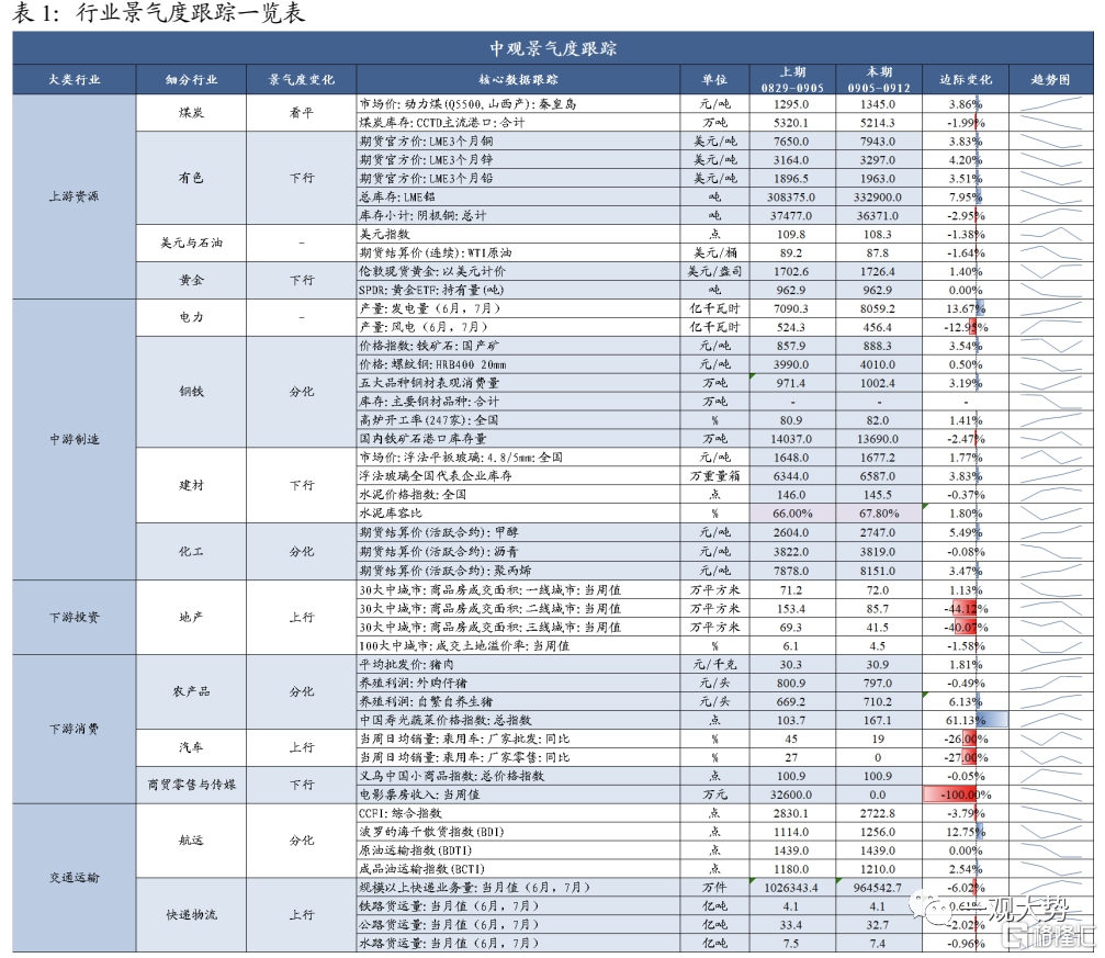下游消费景气回落;中游水泥玻璃需求疲弱;上游煤炭价格延续上涨。上周下游消费景气回落,30大中城市商品房成交面积周环比大幅下滑,生猪价格涨幅趋缓,乘用车销量环比大幅下滑;中游发电量周环比回落,玻璃价格下跌,需求偏弱库存累积,水泥价格小幅下滑;上游煤炭价格大幅上涨,钢材需求改善价格上涨,工业金属价格反弹;交通运输方面,全国货运流量指数、地铁客运量环比下滑,中秋旅游出行需求复苏疲弱;