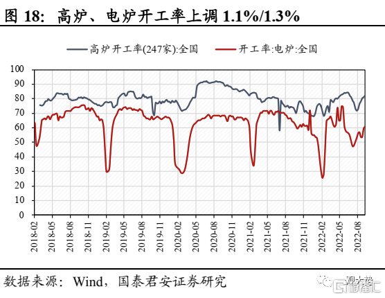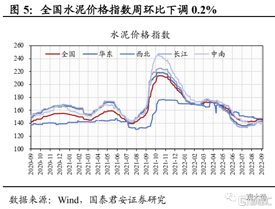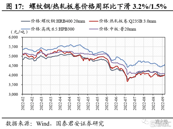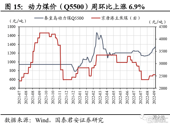 煤炭:产地疫情逐步消退,动力煤价涨幅趋缓。截至 9月 9日,秦皇岛动力煤价(Q5500)报收1345元/吨,周环比上涨3.9%,涨幅较前期明显收窄,主因疫情对供应的影响逐步消退。港口库存延续去化,北方港港口库存周环比下滑2.6%。展望未来,尽管疫情扰动有所减弱,但大秦线秋季检修预计将于10月9日至11月2日展开,叠加安监趋严,供给端偏紧预计仍将对煤价形成支撑。
