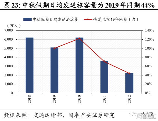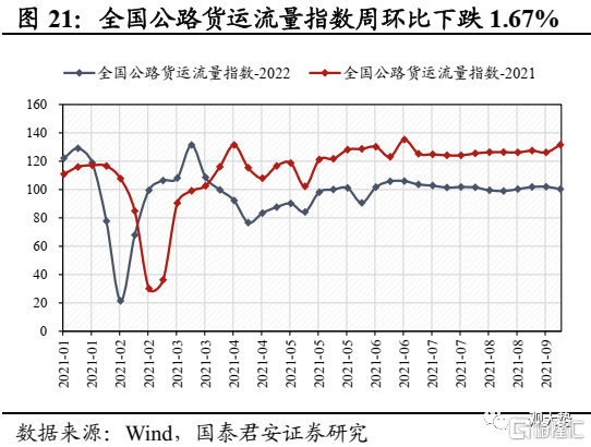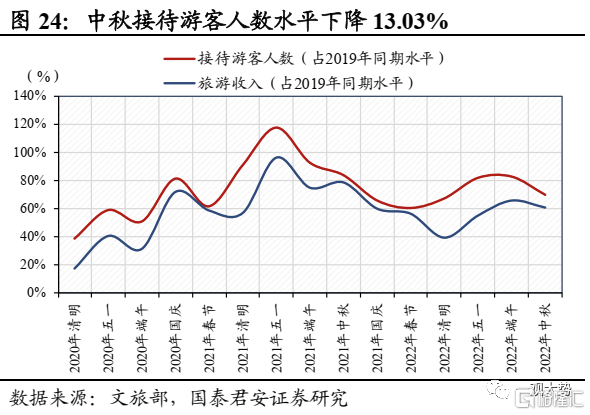 交通运输:货运流量指数环比下跌,中秋旅游出行复苏疲弱。上周全国公路货运流量指数周环比下跌1.67%,主要城市地铁客运量下滑10.17%,主因多地疫情蔓延致使出行活跃度有所下滑;中秋旅游出行复苏疲弱,日均发送旅客量、全国接待游客人数、国内出游人数,国内旅游收入仅恢复至2019年同期43.8%、69.9%、60.7%。