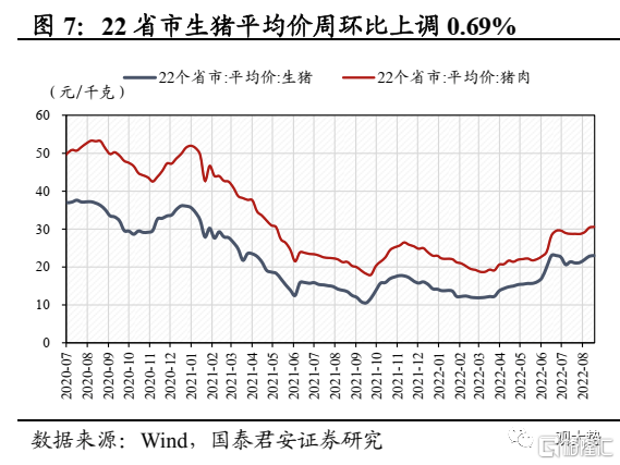 生猪:抛储影响相对有限,猪价延续上涨。上周全国22省市平均生猪/猪肉价格报收23.23元/公斤,周环比小幅上调0.69%,中秋临近叠加学生返校继续支撑需求,但养殖户出栏积极性提升,叠加发改委保供稳价扰动市场情绪,猪价涨幅明显趋缓。考虑到节前抛储为以往惯例,且整体抛储量相对有限,预计难以对猪价运行趋势产生明显影响。据涌益咨询,8月能繁母猪存栏量环比提升1.63%,与7月差异不大,表明当前产能扩张较为犹豫,供给增速整体可控,随着猪肉需求旺季逐步来临,猪价预计仍有较强支撑。