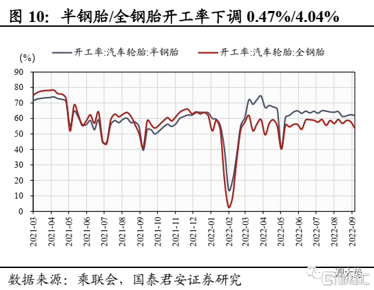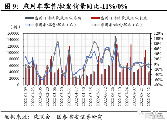 乘用车:疫情反复压制购车需求,乘用车零售销量环比大幅回落。9月1日-12日,我国乘用车零售/批发销量分别为38538/43835辆,环比8月同期变化-11%/0%,主因疫情多地爆发影响消费者购车需求,以及中秋节假期致使销量偏低。当前购置税减免、地方政策的支撑仍较为强劲,若后续疫情形势有所改善,车市仍有望继续走强。