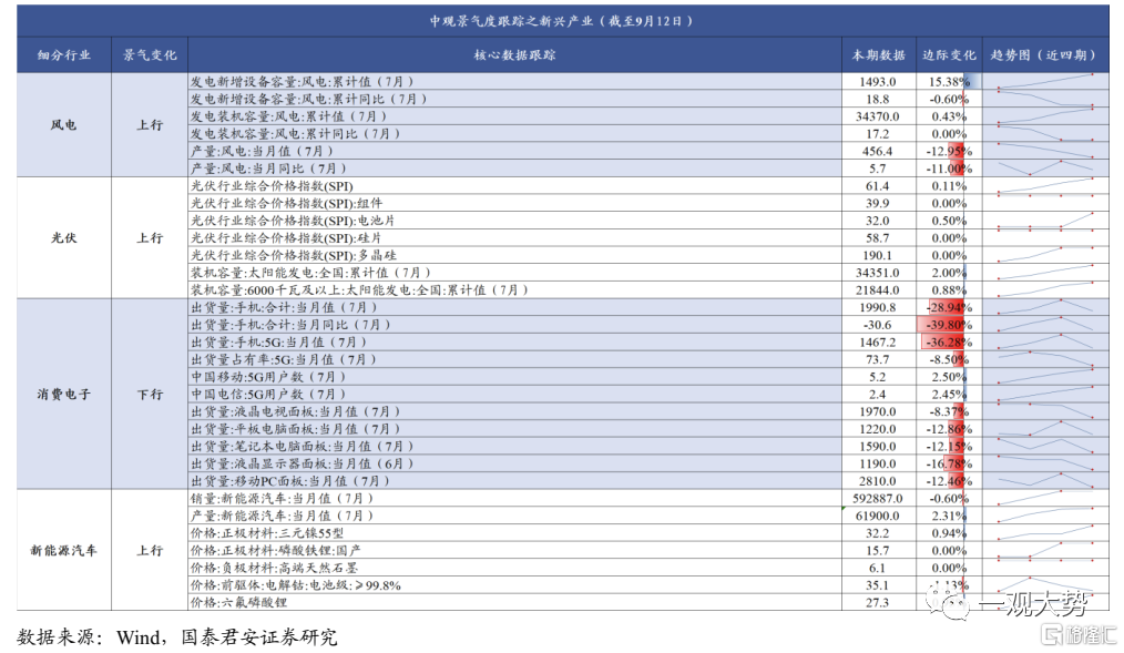 下游消费景气回落;中游水泥玻璃需求疲弱;上游煤炭价格延续上涨。上周下游消费景气回落,30 大中城市商品房成交面积周环比大幅下滑,生猪价格涨幅趋缓,乘用车销量环比大幅下滑;中游发电量周环比回落,玻璃价格下跌,需求偏弱库存累积,水泥价格小幅下滑;上游煤炭价格大幅上涨,钢材需求改善价格上涨,工业金属价格反弹;交通运输方面,全国货运流量指数、地铁客运量环比下滑,中秋旅游出行需求复苏疲弱;基建地产:地产销售大幅下滑,浮法玻璃需求偏弱。上周30大中城市商品房成交面积周环比大幅下滑32%,土拍间歇期土地成交面积明显回落,土地溢价率周环比上升2.88%,但主因多宗商办用地高溢价成交,整体市场热度仍维持低位;浮法玻璃价格周环比下滑1.1%,需求整体偏弱,浮法玻璃生产企业库存周环比增长243万重量箱;水泥价格指数周环比下跌0.2%,主因前期限电涨价区域价格回调;下游消费:猪价延续上涨,乘用车销量环比大幅下滑。22省市生猪平均价周环比上涨0.7%,涨势趋缓主因养殖户出栏加速叠加政府抛储影响市场情绪,8月能繁母猪存栏量环比上升1.63%,供给增速整体可控,需求旺季临近仍将对猪价提供支撑;乘用车零售/批发销量环比8月同期变化-11%/0%,零售销量大幅下滑主因疫情多地爆发影响消费者购车需求,以及中秋节假期致使销售数据偏低;中游制造:发电量环比回落,8月新能源车零售表现亮眼。上周发电量环比/同比下滑5.6%/2.1%,主因高温天气继续缓解,制冷负荷下滑;8月新能源车零售销量同比增长103.9%,渗透率达28.3%,销量高增主因各地出台鼓励消费政策力度较;8月动力电池装车量27.8GWh,同比增长121.3%,行业高景气延续;上游资源:动力煤价持续上涨,工业金属价格反弹。上周秦皇岛动力煤价(Q5500)周环比上涨3.9%,北方港港口库存周环比回落2.6%,产地疫情对供给端扰动逐步消退,但大秦线检修叠加安监趋严仍将支撑煤价高位;螺纹钢/热轧板卷价格周环比上涨1.0%/2.0%,库存延续去化;金属铜/铝价周环比上涨3.6%/1.6%,主因供给端限电扰动延续。交通运输:货运流量指数环比下跌,中秋旅游出行复苏疲弱。上周全国公路货运流量指数周环比下跌1.67%,主要城市地铁客运量下滑10.17%,主因多地疫情蔓延致使出行活跃度有所下滑;中秋旅游出行复苏疲弱,日均发送旅客量、全国接待游客人数、国内出游人数,国内旅游收入仅恢复至2019年同期43.8%、69.9%、60.7%。