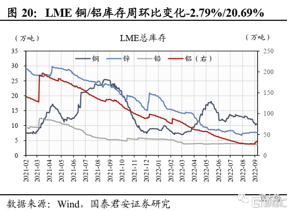 有色:限电扰动延续,工业金属价格反弹。截至 9 月13日,长江有色市场铜/铝价分别报收6.40/1.87万元/吨,周环比上涨3.6%/1.6%。金属铜方面,国内需求向旺季过渡,加工厂逢低采购较多,供给端受限电及铜精矿供给不足影响有所下滑,供需偏紧支撑铜价。金属铝方面,供给端四川重庆电力紧张缓解,云南限产扰动仍在,疫情局部爆发下,需求端恢复相对有限,供需双弱格局下铝价有望维持震荡。