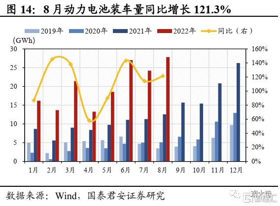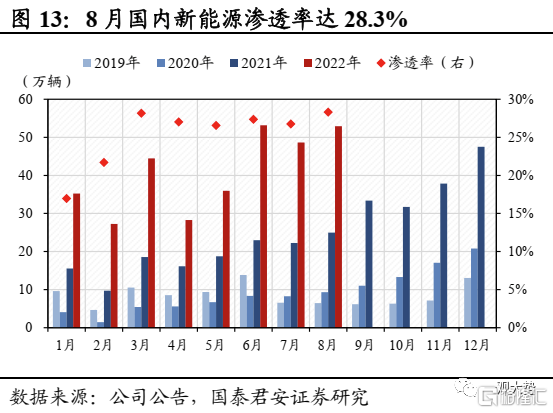 新能源车:8月新能源车零售表现亮眼,动力电池装车量同比高增。据乘联会统计,8月新能源车零售销量52.9万辆,同比增长103.9%,渗透率达28.3%,较7月继续增长1.6%,销量高增主因各地出台鼓励消费政策力度较大。随着9月购车旺季逐步到来,行业高景气有望延续。8月我国动力电池装车量27.8GWh,同比增长121.3%。其中三元电池装车量19.3GWh,同比增长130.1%;碳酸铁锂电池装车量 30.8GWh,同比增长 177.5%。