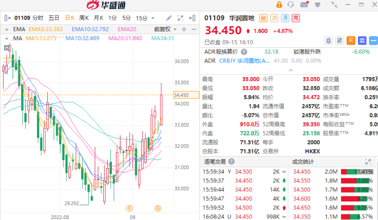 - 华润置地是中国华润集团旗下的地产开发商,上半年实现基本盈利增2.6%,中期每股派息增5.2%,平均开盘周期较2021年缩短2.2个月至7.2个月,签约销售额排名提升至行业前五。里昂发布研究报告称,相信公司的抵御能力,预计投资物业业务收入将恢复增长,并部分抵销了下半年物业开发利润下跌。