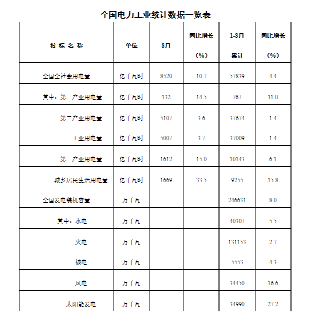 1-8月份,全国发电设备累计平均利用2499小时,比上年同期减少67小时。其中,火电2930小时,比上年同期减少64小时;核电4995小时,比上年同期减少224小时;风电1460小时,比上年同期减少40小时。