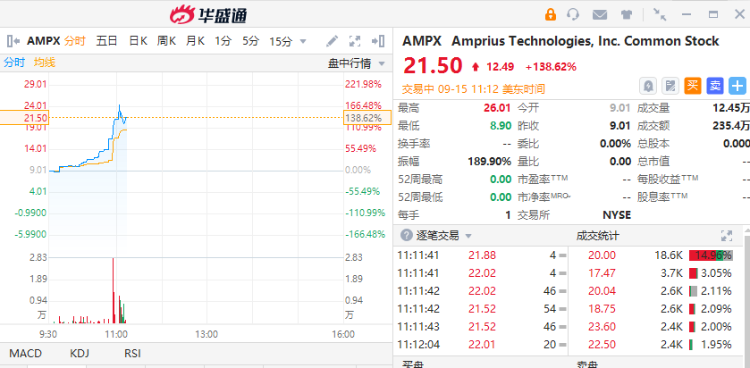 华盛资讯9月15日消息,Amprius Technologies $AMPX 今日登录美股市场,首挂高开高走,一度大涨189.90%;截止发稿,涨幅收窄至138.62%,报21.5美元。