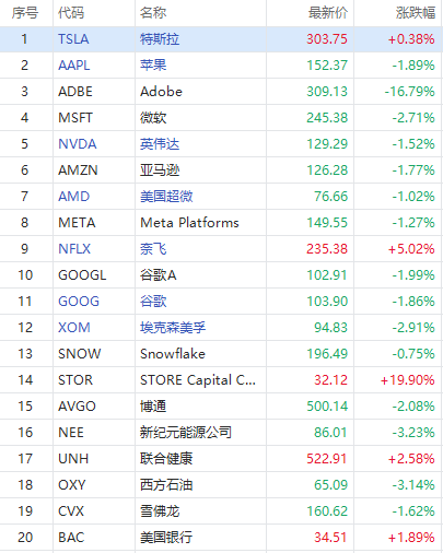 第3名Adobe收盘大跌16.79%,成交87.2亿美元。Adobe宣布以约200亿美元的现金和股票收购在线设计协作工具平台Figma。该公司称将和Figma将共同重塑创造力和生产力的未来,加速网络上的创造力,推进产品设计,并激励全球创作者、设计师和开发人员社区。