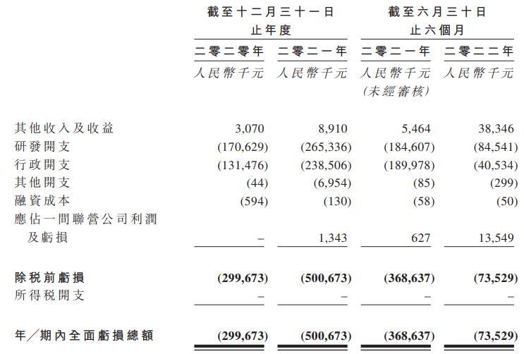 于2020 年、2021年及2022年截至6月30日止六个月,公司研发开支分别约为1.71亿元、2.65亿元及8454.1万元人民币;同期,亏损总额分别约为3.00亿元、5.01亿元及7353.0万元人民币。
