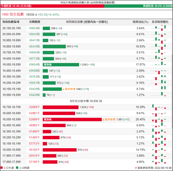 街货分布方面,至周四,恒指牛证街货重货区间主要仍在收回价18400点至18800点之间,累计相当约4,299张期指合约;恒指熊证街货重货区主要在收回价19500点至19900点,累计相当约2,355张期指合约。