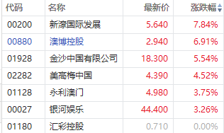 华盛资讯9月16日消息,港股博彩股逆势走强,新濠国际发展涨近8%,澳博控股涨近7%,金沙中国有限公司涨超5%,美高梅中国涨超4%,永利澳门、银河娱乐涨超3%。