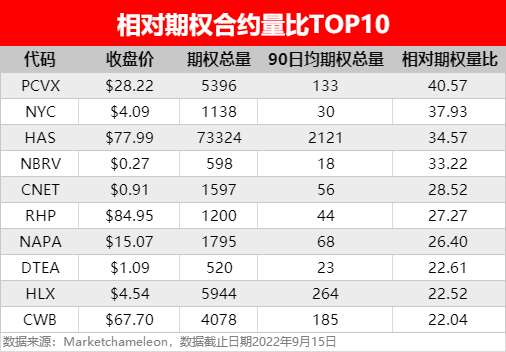 注:相对成交量比,是指当前交易日期权成交数量与90日平均期权成交数量的比值,相对成交量比越高,意味着该期权标的近期活跃度越高,不同于期权成交总量,该量比指标可以帮助发现一些期权成交数量绝对值不高,但是近期成交数量显著上升的期权标的。