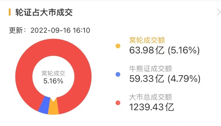 其中,窝轮总成交额为63.98亿港元,牛熊证总成交额为59.33港元。