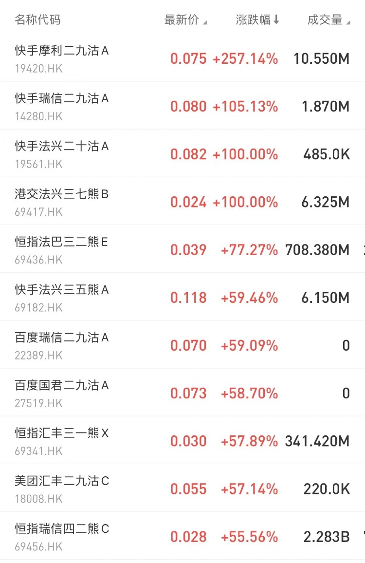 在今日涨幅榜中,快手摩利二九沽A $19420.HK 涨257.14%;港交法兴三七熊B $69417.HK 涨100%。