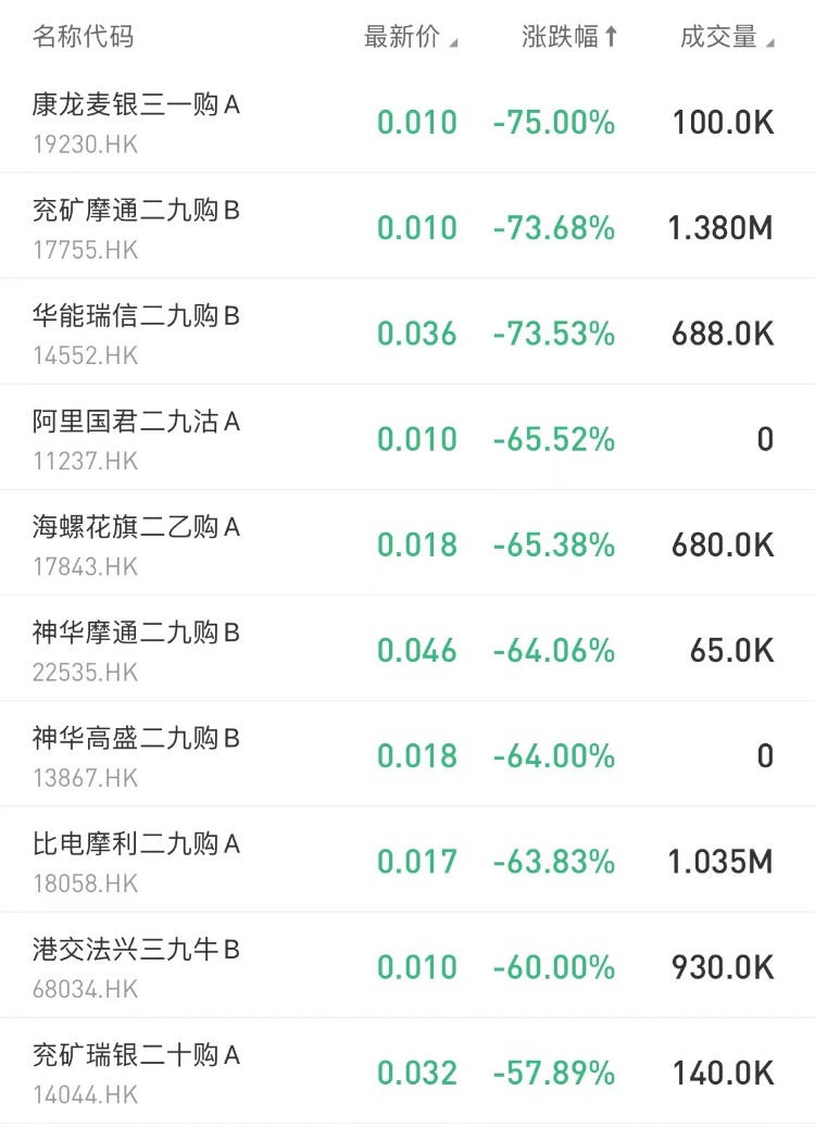 在今日跌幅榜中,康龙麦银三一购A $19230.HK 跌75%;兖矿摩通二九购B $17755.HK 跌73.68%。