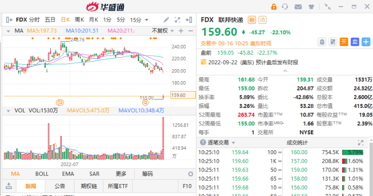 美股物流股走低,联邦快递大跌22.10%,报159.60美元,之前,公司宣布撤销全年业绩指引,公司CEO暗示全球经济可能衰退;XPO物流 $XPO 跌超6%,联合包裹跌一度超5%,现跌幅收窄至3.74%,亚马逊跌3.5%。