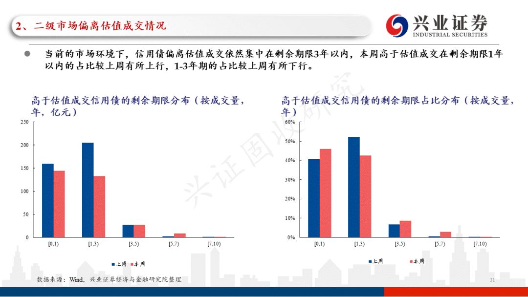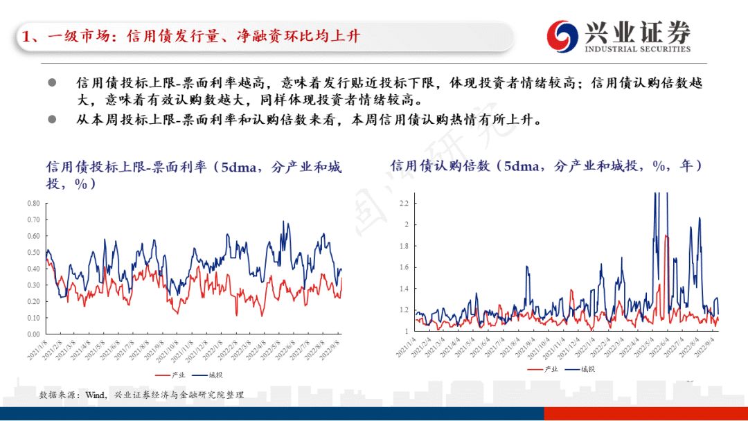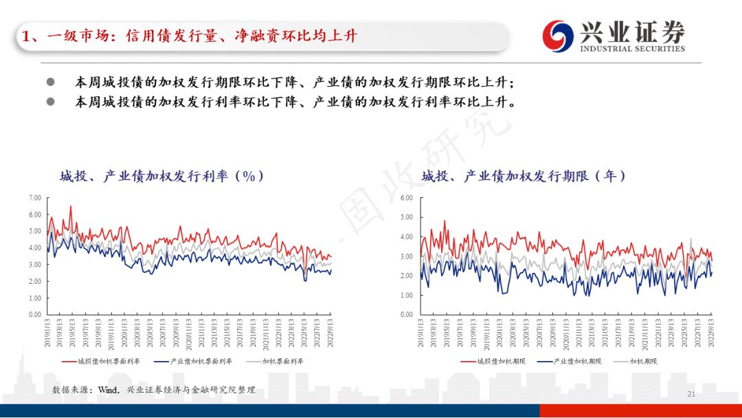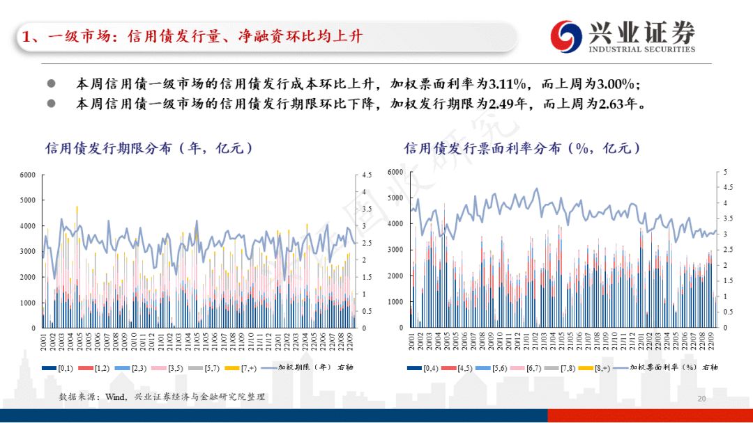 本周信用债一级市场的信用债发行成本环比上升,加权票面利率为3.11%,而上周为3.00%;本周信用债一级市场的信用债发行期限环比下降,加权发行期限为2.49年,而上周为2.63年。