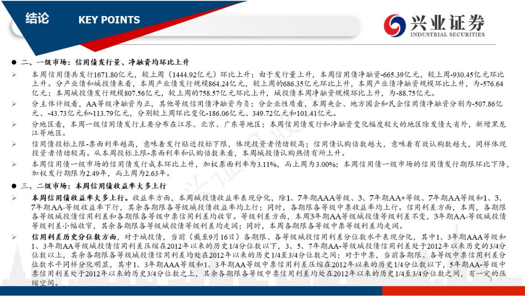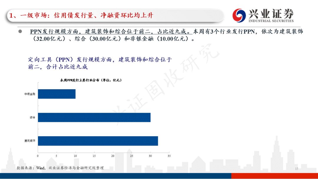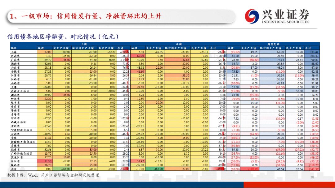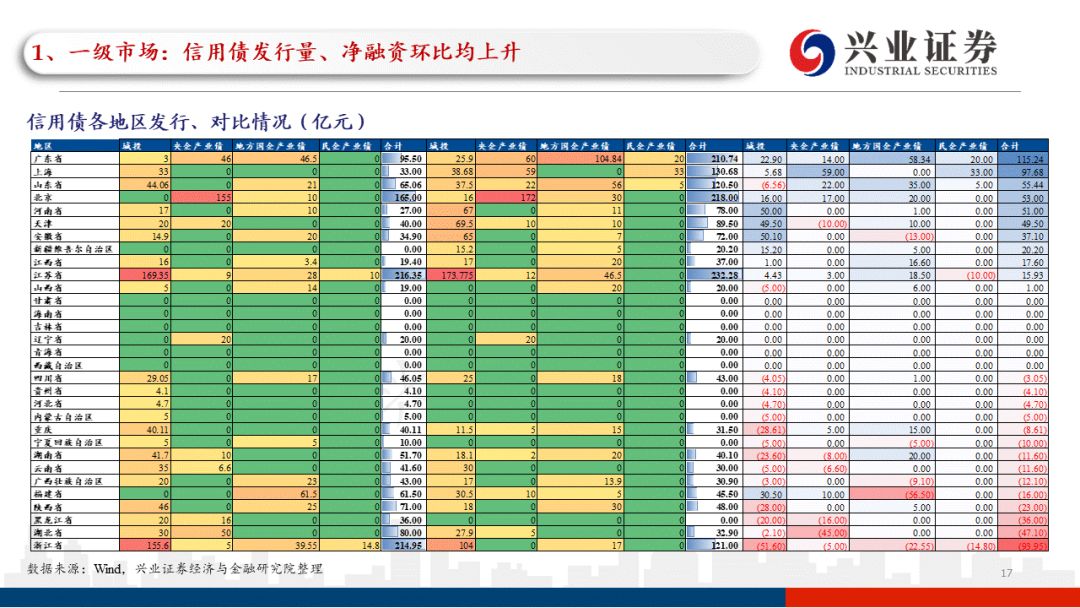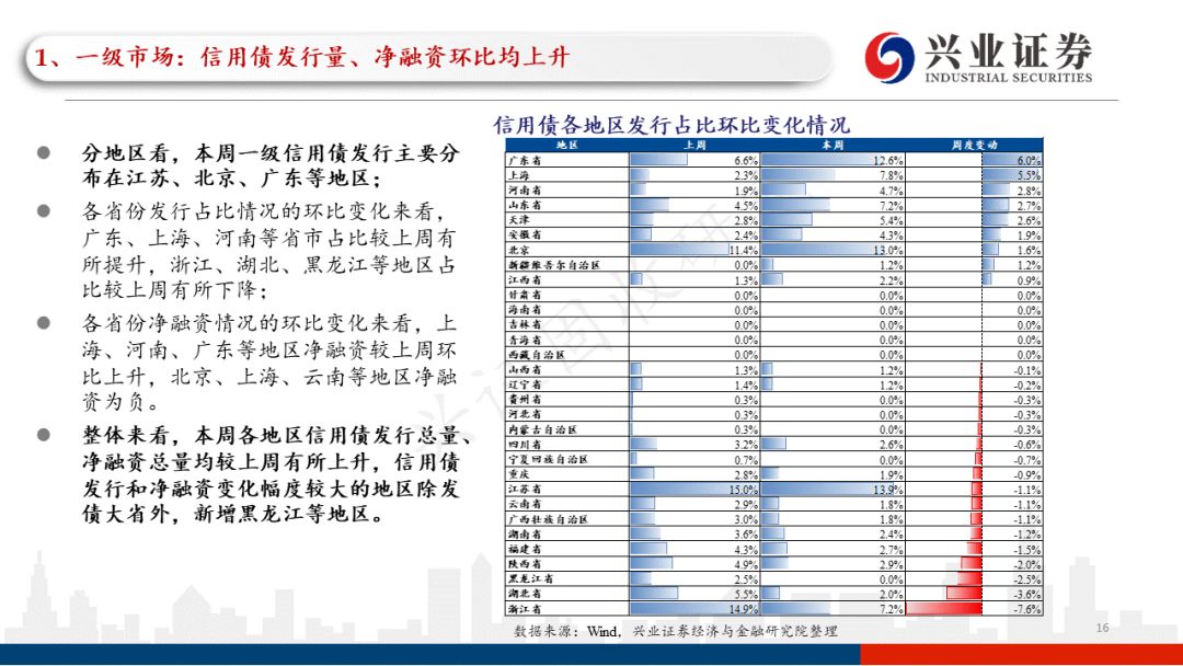 分地区看,本周一级信用债发行主要分布在江苏、北京、广东等地区;本周信用债发行和净融资变化幅度较大的地区除发债大省外,新增黑龙江等地区。