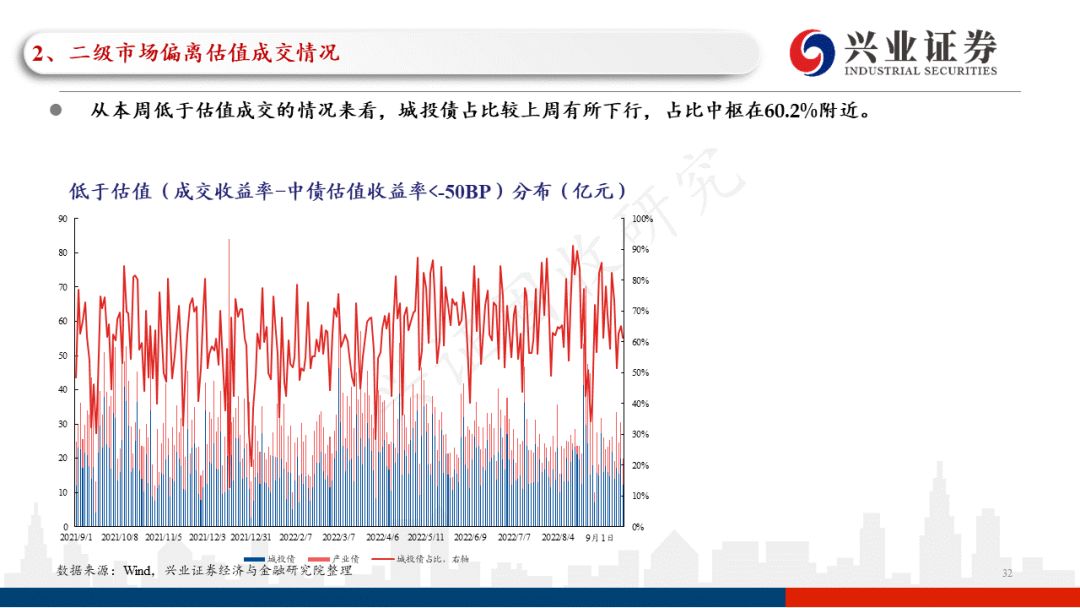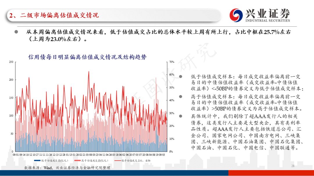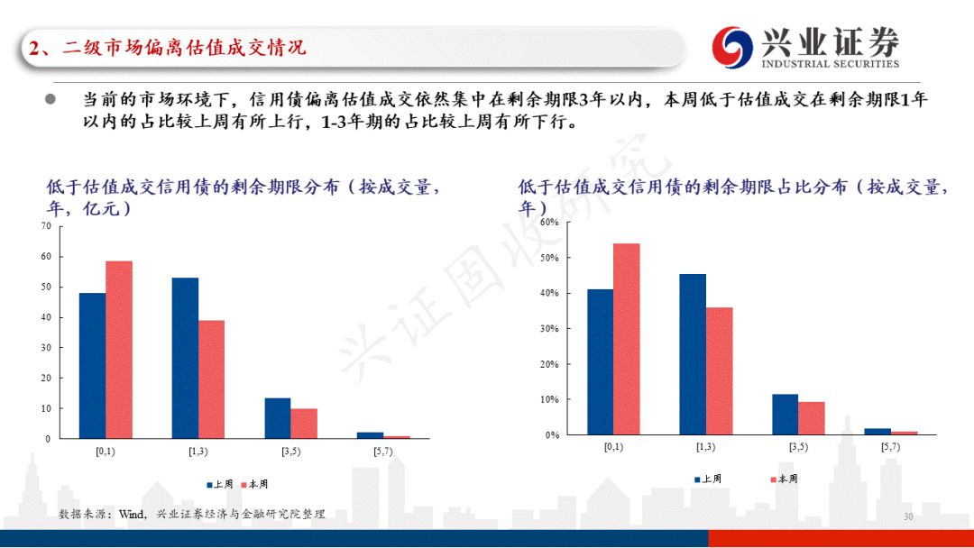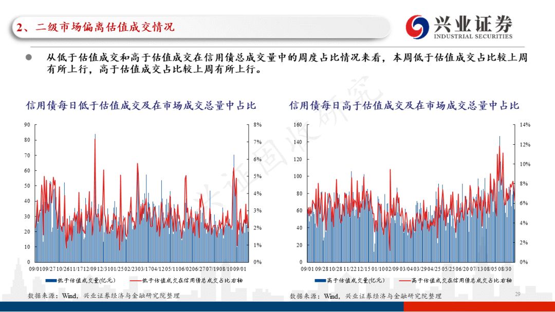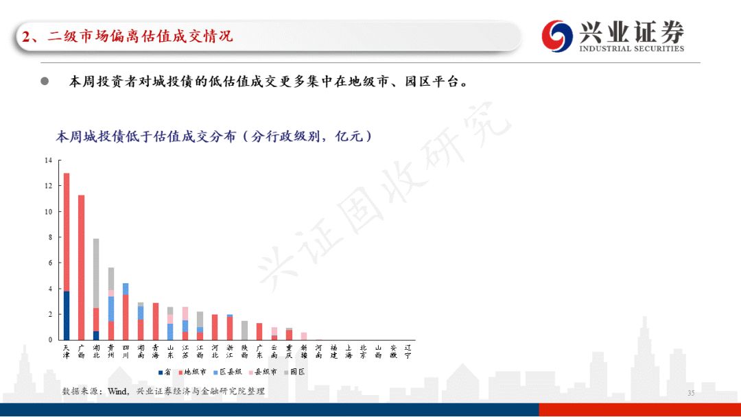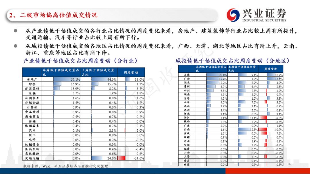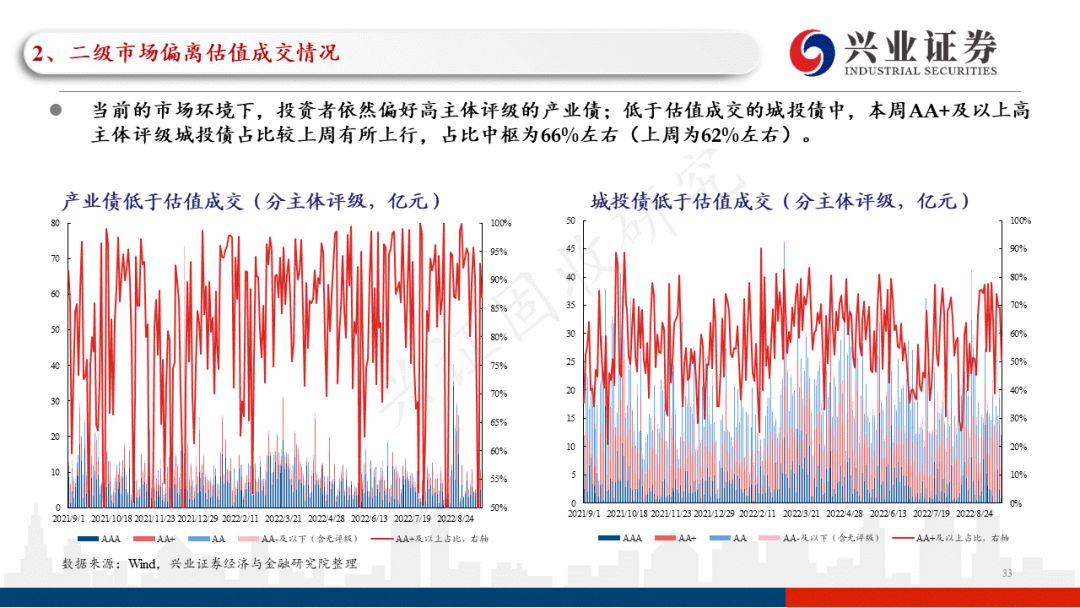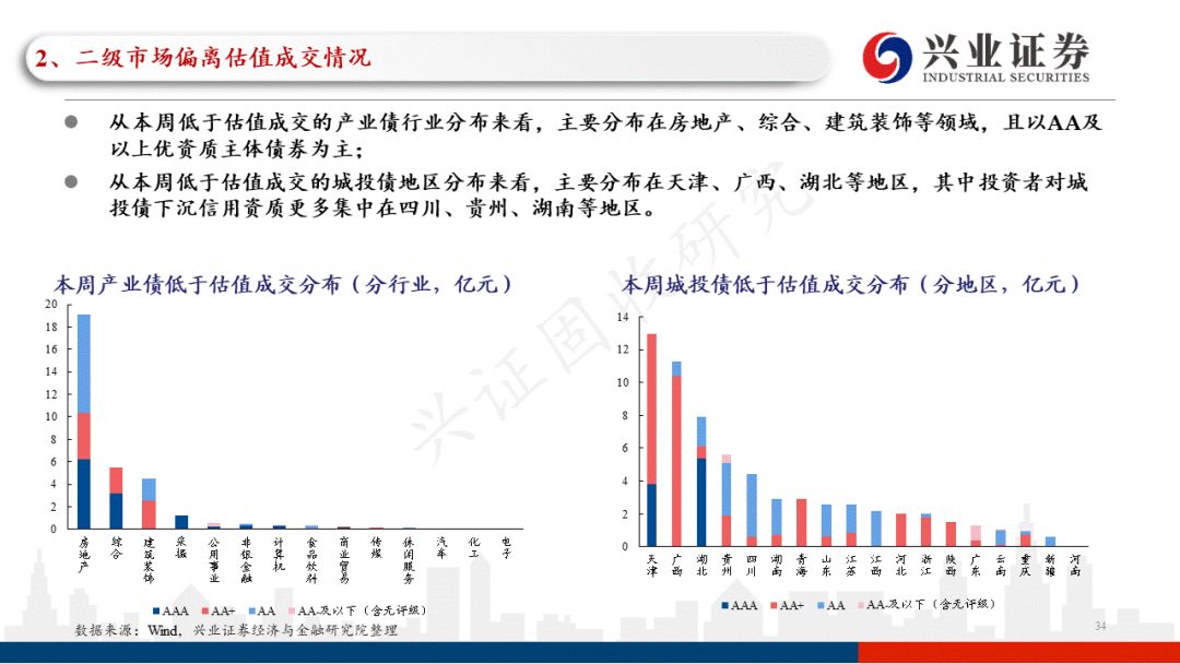 从本周偏离估值成交情况来看,低于估值成交占比的总体水平较上周有所上行,占比中枢在25.7%左右(上周为23.0%左右)。低于估值成交中,城投债占比较上周有所下行。分主体评级来看,当前的市场环境下,投资者依然偏好高主体评级的产业债,本周低于估值成交的AA+及以上高主体评级城投债占比较上周有所下行。从本周低于估值成交的产业债行业分布来看,主要分布在房地产、综合、建筑装饰等领域,且以AA及以上优资质主体债券为主;从本周低于估值成交的城投债地区分布来看,主要分布在天津、广西、湖北等地区,其中投资者对城投债下沉信用资质更多集中在四川、贵州、湖南等地区。分行政级别来看,本周投资者对城投债的低估值成交更多集中在地级市、园区平台。