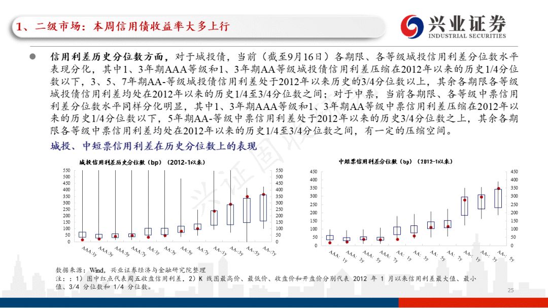 信用利差历史分位数方面,对于城投债,当前(截至9月16日)各期限、各等级城投信用利差分位数水平表现分化,其中1、3年期AAA等级和1、3年期AA等级城投债信用利差压缩在2012年以来的历史1/4分位数以下,3、5、7年期AA-等级城投债信用利差处于2012年以来历史的3/4分位数以上,其余各期限各等级城投债信用利差均处在2012年以来的历史1/4至3/4分位数之间;对于中票,当前各期限、各等级中票信用利差分位数水平同样分化明显,其中1、3年期AAA等级和1、3年期AA等级中票信用利差压缩在2012年以来的历史1/4分位数以下,5年期AA-等级中票信用利差处于2012年以来的历史3/4分位数之上,其余各期限各等级中票信用利差均处在2012年以来的历史1/4至3/4分位数之间,有一定的压缩空间。