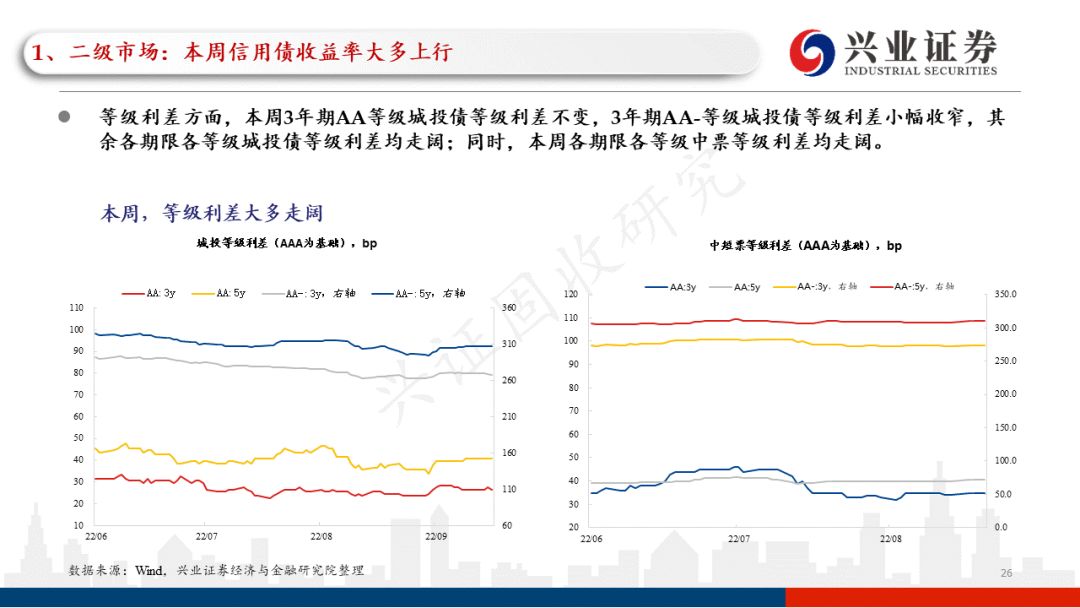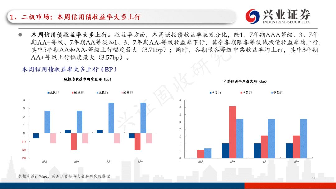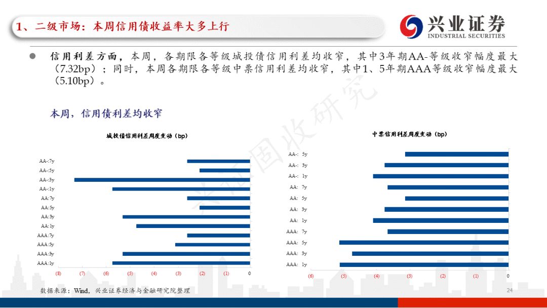 本周信用债收益率大多上行。收益率方面,本周城投债收益率表现分化,除1、7年期AAA等级、3、7年期AA+等级、7年期AA等级和1、3、7年期AA-等级收益率下行,其余各期限各等级城投债收益率均上行;同时,各期限各等级中票收益率均上行。信用利差方面,本周,各期限各等级城投债信用利差和各期限各等级中票信用利差均收窄。等级利差方面,本周3年期AA等级城投债等级利差不变,3年期AA-等级城投债等级利差小幅收窄,其余各期限各等级城投债等级利差均走阔;同时,本周各期限各等级中票等级利差均走阔。