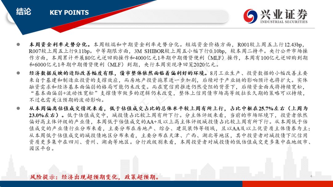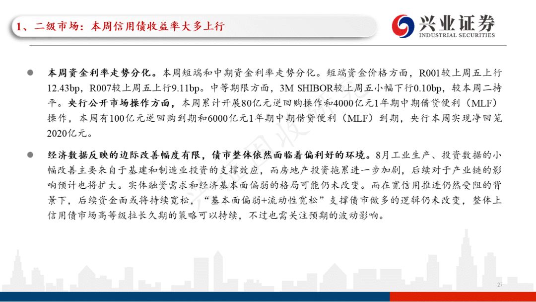 经济数据反映的边际改善幅度有限,债市整体依然面临着偏利好的环境。8月工业生产、投资数据的小幅改善主要来自于基建和制造业投资的支撑效应,而房地产投资拖累进一步加剧,后续对于产业链的影响预计也将扩大。实体融资需求和经济基本面偏弱的格局可能仍未改变。而在宽信用推进仍然受阻的背景下,后续资金面或将持续宽松,“基本面偏弱+流动性宽松”支撑债市做多的逻辑仍未改变,整体上信用债市场高等级拉长久期的策略可以持续,不过也需关注预期的波动影响。