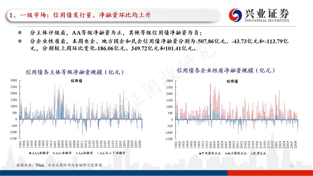 分主体评级看,AA等级净融资为正,其他等级信用债净融资为负;分企业性质看,本周央企、地方国企和民企信用债净融资分别为-507.86亿元、-43.73亿元和-113.79亿元,分别较上周环比变化-186.06亿元、349.72亿元和101.41亿元。