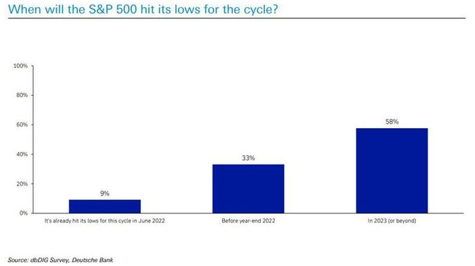 投资者情绪越发悲观,德意志银行上周公布的最新调查显示,只有9%的受访者认为标普500指数已触及周期低点。74%的受访者预计未来可能先跌至3300点。同时,79%的人预计美国下次经济衰退将在明年到来。