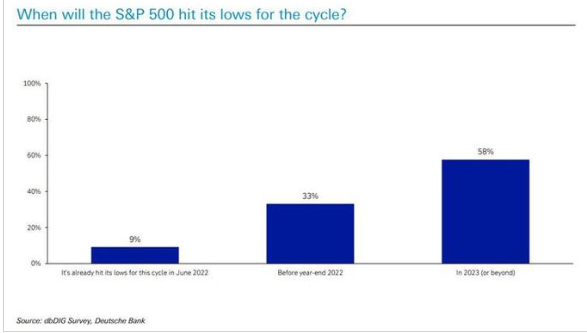 投资者情绪越发悲观,德意志银行上周公布的最新调查显示,只有9%的受访者认为标普500指数已触及周期低点。74%的受访者预计未来可能先跌至3300点。同时,79%的人预计美国下次经济衰退将在明年到来。