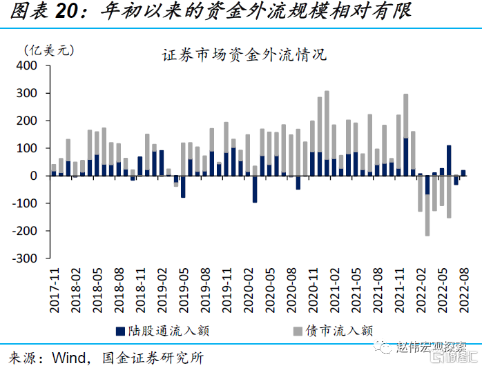 估值变动是我国外汇储备减少的重要原因,年初以来证券市场资金外流的总规模则相对有限。年初以来的外储减少中,估值变动是重要的原因之一。当下我国外储约59%均为美元资产,以证券形式持有为主。一方面,美债收益率上涨会带来美元资产部分的减值;另一方面,美元升值也会带来其他外币资产的减值。年初以来,估值带来外储缩水3832亿美元左右,是外汇储备不增反减的主因。而相较而言,金融项下的资金外流规模则相对有限。今年以来股债两市的资金外流总规模仅608亿美元,且近期明显放缓。