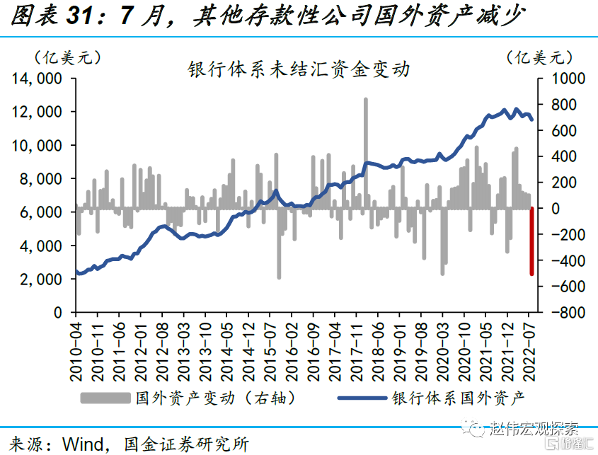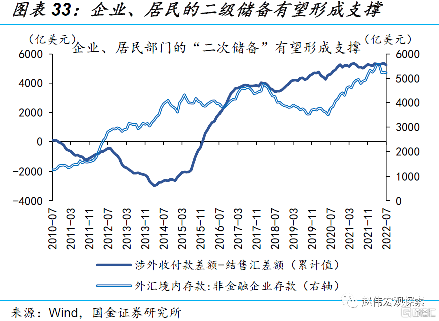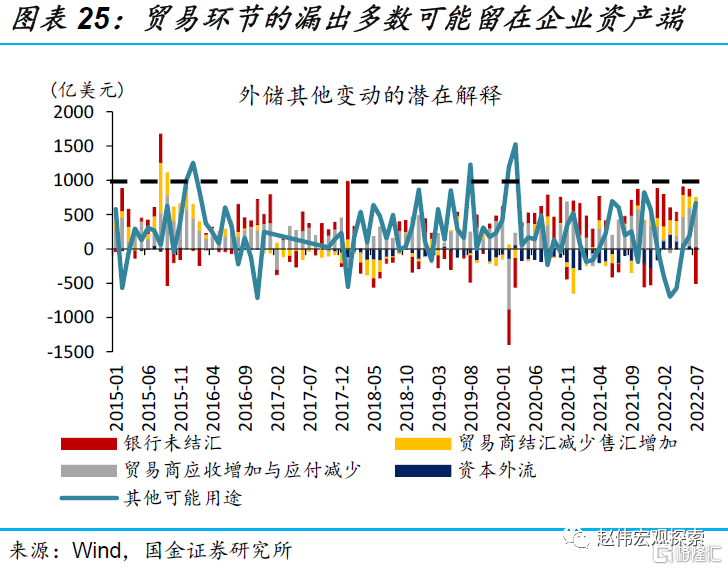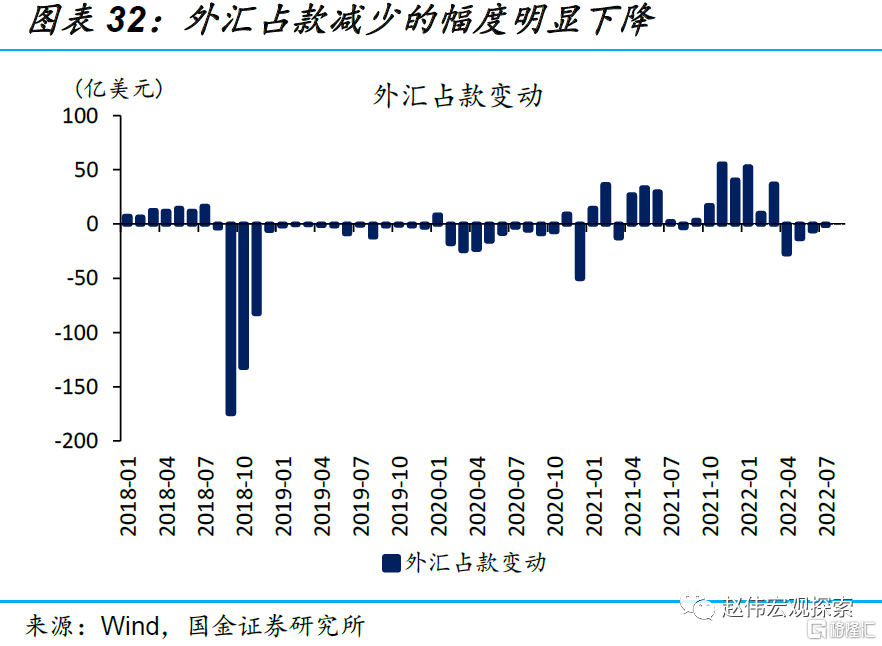 4) 短期来看,强美元压制下,人民币或仍有一定贬值压力;而企业、银行结汇意愿的变化,或有助于减少贸易环节漏出,增加美元供给、放缓贬值速度。就市场影响来看,当下资金外流压力已经减弱,造成的市场冲击或相对有限。一方面,前期贸易顺差下,大量美元资金在企业、居民部门积累,形成“二级储备”,成为人民币贬值的“缓冲垫”;另一方面,今年2月至7月间,投机型资金已出现过集中流出;7月以来,资金外流已边际放缓。