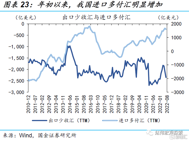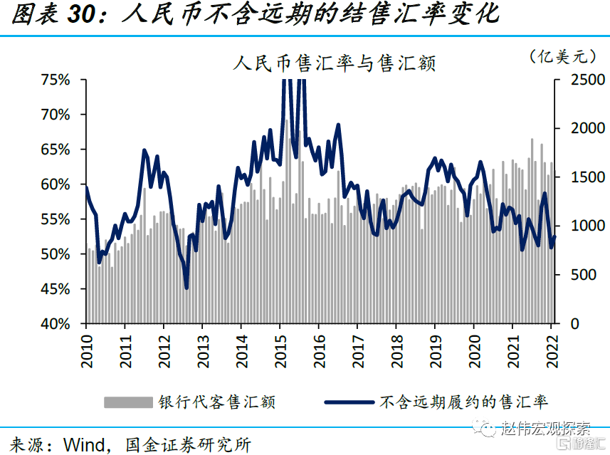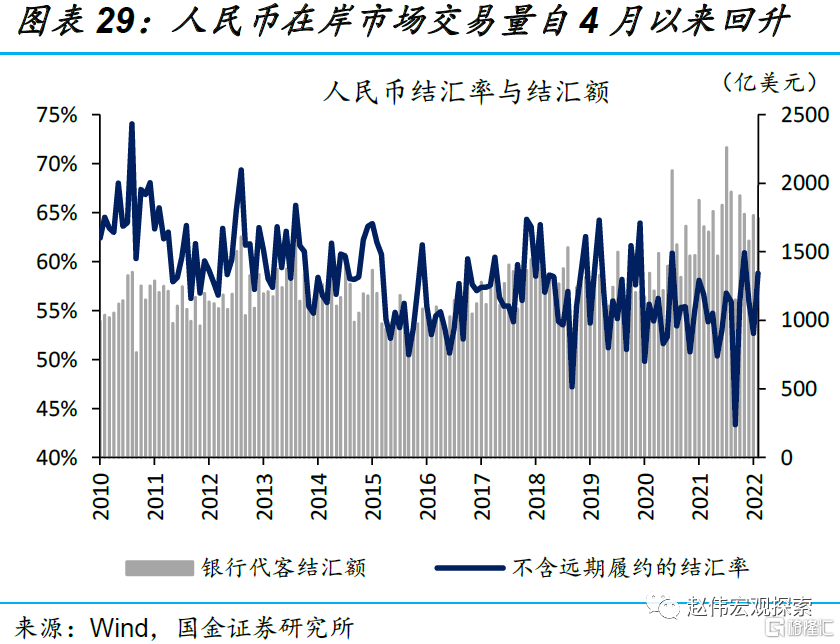 短期来看,强美元压制下,人民币或仍有一定贬值压力;但外汇市场上企业结售汇、银行结汇意愿等变化,或将缓和人民币贬值速度。能源价格高企下,欧、日相较美国衰退程度或将更深,这将支撑美元维持强势。本轮贬值的主因是美元压制,美元筑顶前,人民币仍有贬值压力。而企业、银行结汇意愿的变化,或有助于减少贸易环节漏出,增加美元供给、放缓贬值速度。