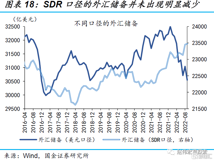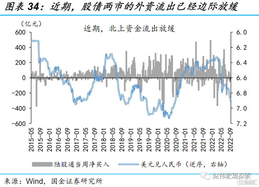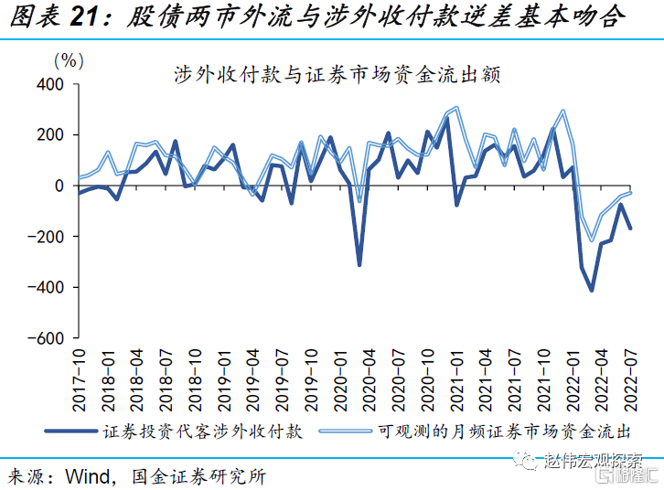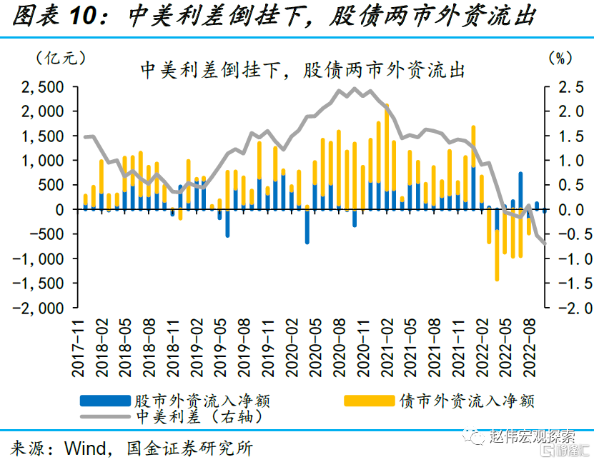 3) 估值变动、贸易环节漏出是我国外汇储备减少的主要原因,金融项下资金外流规模相对有限。当下我国外储约59%均为美元资产,以证券形式持有为主。美债收益率上行会带来美元资产部分的减值,美元升值也会带来其他外币资产的减值。年初以来,估值带来的外储缩水为3832亿美元左右,贸易环节漏出留存在贸易商资产端的外汇约3285亿美元,这两大项可以解释年初以来贸易与外储差额的94%,股债市场资金外流影响或相对有限。