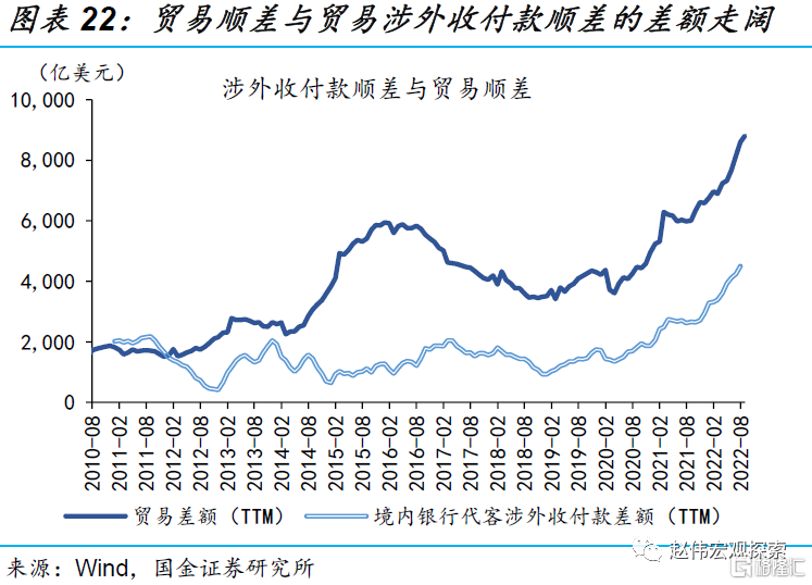 贸易与外储缺口的剩余部分,多是贸易至结汇路径上的漏出,主要集中留存在企业部门的资产端。年初以来,贸易顺差→贸易商经境内银行收付→贸易商与境内银行结售汇→境内银行与央行结售汇→央行外汇储备增减的路径上,贸易商应收增加/应付减少约1929亿美元、贸易商境内存款增加约1355亿美元、商业银行未与央行结汇资金879亿美元。贸易与外汇储备的缺口,多体现在贸易商、银行的外币资产上,带来“二级储备”快速积累。