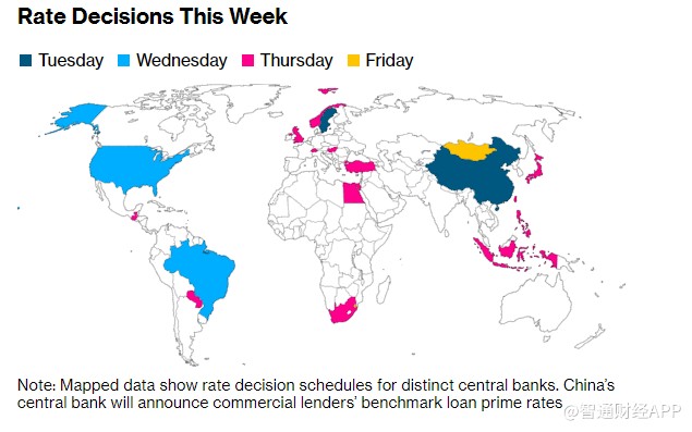 包括美联储在内的全球多家央行本周将陆续公布利率决议。预计全球主要央行本周累计加息超过500个基点,如果官员们选择更激进的举措,加息幅度可能会更大。