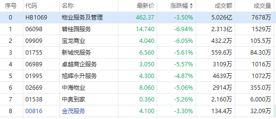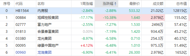 港股地产及物管板块继续走低,旭辉控股集团(00884.HK)跌近11%,富力地产(02777.HK)、合景泰富集团(01813.HK)、碧桂园服务(06098.HK)均跌超7%,碧桂园(02007.HK)跌5.3%,融创服务(01516.HK)跌4%。