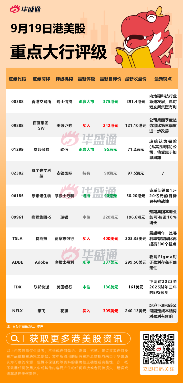 瑞信发表研究报告指出,报道称港交所正计划放宽对硬科技公司来港上市的收入要求,该行相信有关倡议虽然未必完全出乎市场意料,但由于内地硬科技行业急速发展,料对港交所集资有利。该行将港交所今年日均成交额预测由1290亿港元下调至1240亿港元,略低于市场预期。此外,该行将其2022至2024年的每股盈利预测下调3.7%、1.4%及2.4%。目标价相应由396港元降至375港元,维持跑赢大市评级。