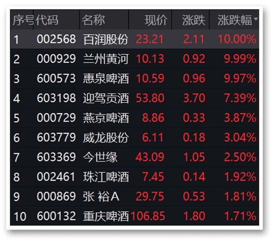 今日酒类股表现回暖。截至收盘,百润股份、兰州黄河、惠泉啤酒涨停,迎驾贡酒涨逾7%,燕京啤酒涨逾3%,山西汾酒、泸州老窖、五粮液涨幅均超1%,贵州茅台上涨0.68%。