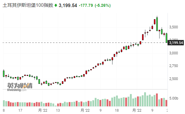 截止周一收盘,土耳其伊斯坦布尔100指数收跌5.26%,报3199点。今年迄今,该指数涨逾72%;而在上周二(9月13日)大跌之前,该指数年内涨幅为85%。
