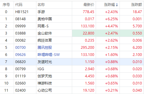 华盛资讯9月20日消息,手游股早盘集体走高,截至发稿,网易-S(09999.HK)涨超4%,金山软件(03888.HK)涨超3%,腾讯控股(00700.HK)涨超2%,哔哩哔哩-SW涨1.68%,创梦天地、心动公司跟涨。