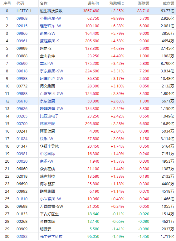 造车新势力集体走强,小鹏汽车-W涨9.99%,理想汽车-W涨超6%;科网股多数走强,携程集团-S涨4.58%,美团-W、京东集团-SW涨超3%,阿里巴巴-SW涨3.17%。