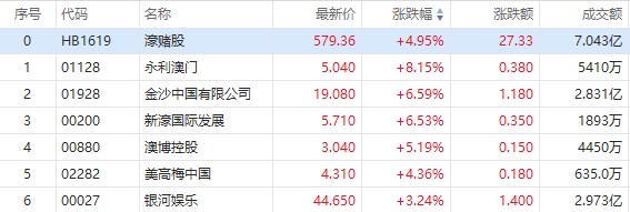 华盛资讯9月20日讯,博彩股午后涨势扩大,截至发稿,永利澳门涨8.15%,新濠国际发展、金沙中国涨6%,澳博控股涨5%,银河娱乐涨3%。