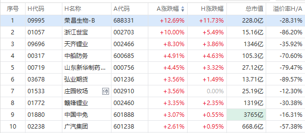 截至发稿,荣昌生物A股涨12.69%,H股现涨11.73%;浙江世宝A股涨停,H股现涨5.49%;天齐锂业A股涨8.3%,H股现涨3.86%。