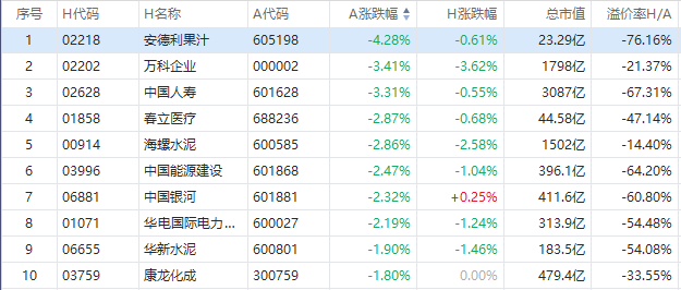 安德里果汁A股跌4.28%,H股现跌0.61%;万科企业A股跌3.41%,H股现跌3.62%;中国人寿A股跌3.31%,H股现跌0.55%。