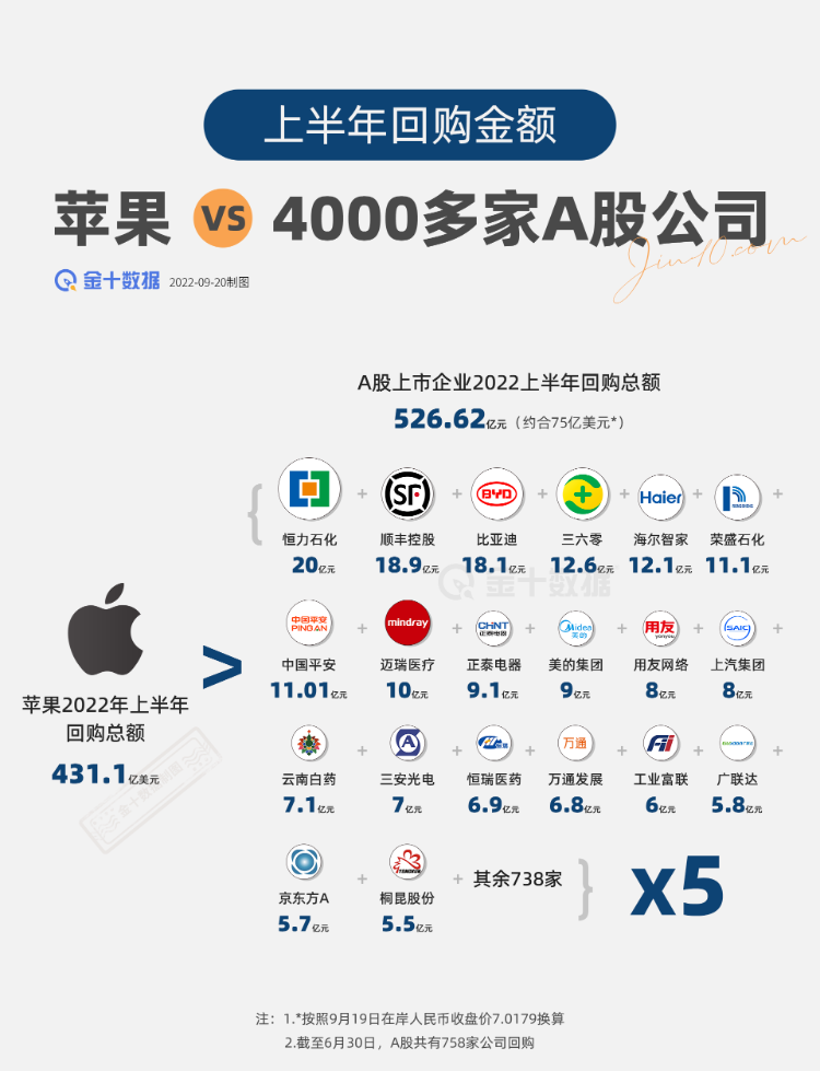 Wind数据显示,截至6月30日,A股共有758家上市公司进行回购,回购总额达526.62亿元,按照9月19日在岸人民币收盘价7.0179换算成美元,约合75亿美元;苹果上半年回购总额达431亿美元,比A股公司上半年回购总额多了4倍多。