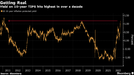 1、10年期美债实际收益率升至2011年以来的最高水平