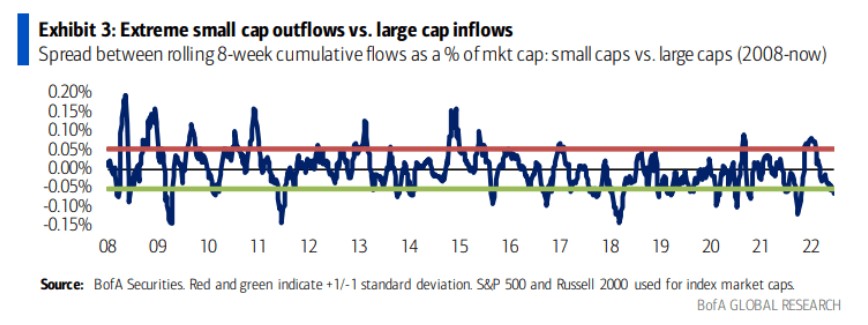 根据最新的每周调查显示,美国银行的客户仍在将现金投入大盘股,并撤出小盘股。但该行股票团队表示,这一趋势更有利于市值较小的股票。