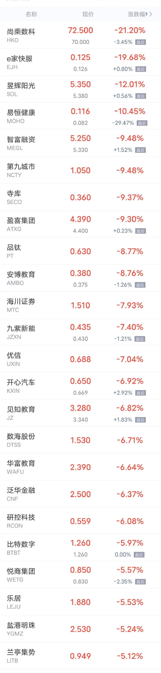 尚乘数科跌超21%,e家快服跌超19%,易恒健康跌超10%,智富融资、第九城市、寺库、盈喜集团跌超9%,优信跌超7%,开心汽车、见知教育、数海股份、华富教育、泛华金融等跌超6%,比特数字、悦商集团、乐居、兰亭集势等跌超5%,奥瑞金种业、叁腾科技、中国医药控股有限公司、高途、诺华家具、小白买买、趣活、洪恩等跌超4%。