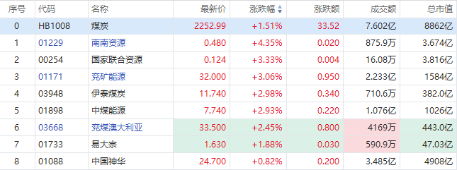 华盛资讯9月22日消息,港股煤炭股午后拉升走强。截至发稿,南南资源涨4.35%,兖矿能源涨3.06%,报32港元每股,成交额2.23亿港元;伊泰煤炭涨近3%,中煤能源涨2.93%,易大宗、中国神华跟涨。消息面上,近日公布的煤炭生产数据显示,原煤生产保持稳定,进口由降转升,煤价延续上涨态势。
