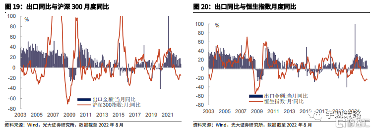 出口通过影响整体经济情况影响大盘走势。出口数据与A股和港股的走势具有一定相关性。在出口数据回落期间,市场大概率表现不佳。但这主要因为A股和港股走势主要受到中国整体经济景气度的影响,呈现出同涨同跌的规律。相比较而言,港股对PMI变化的反应更为敏感。出口数据通过影响整体经济情况影响大盘走势,其单独的涨跌对市场走势的影响力有限。